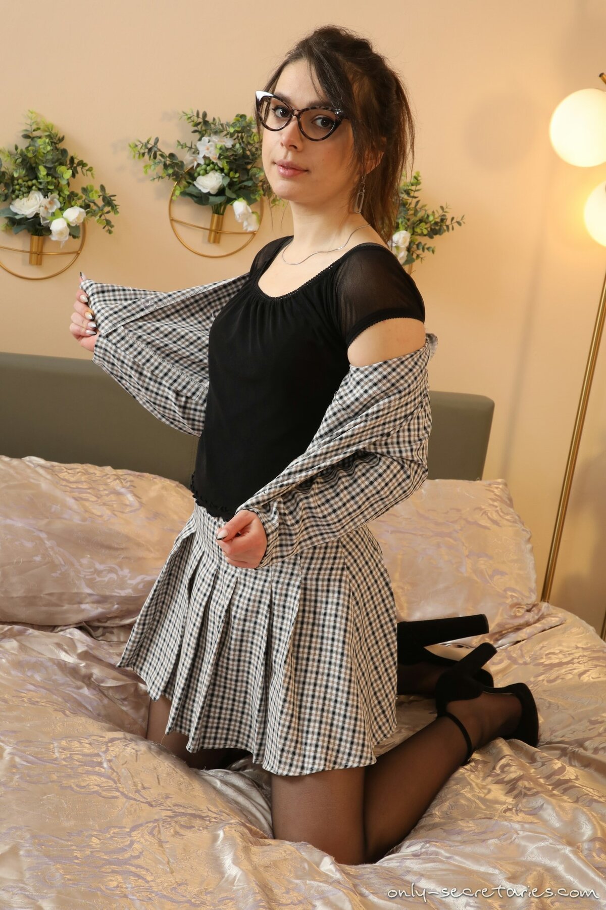 Gia in Only Secretaries set Pleated Miniskirt Black Stockings