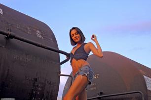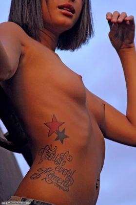outdoor brunette shorts tan lines short hair navel piercing jeans small areolas